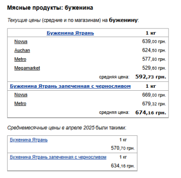 Буженина "Ятрань" увеличилась в стоимости в среднем более чем на 20 гривен - с 570,70 до 592,73 гривны за килограмм. Сразу на 40 гривен увеличилась средняя цена буженины "Ятрань" запеченной с черносливом - до 674,16 гривны за килограмм.